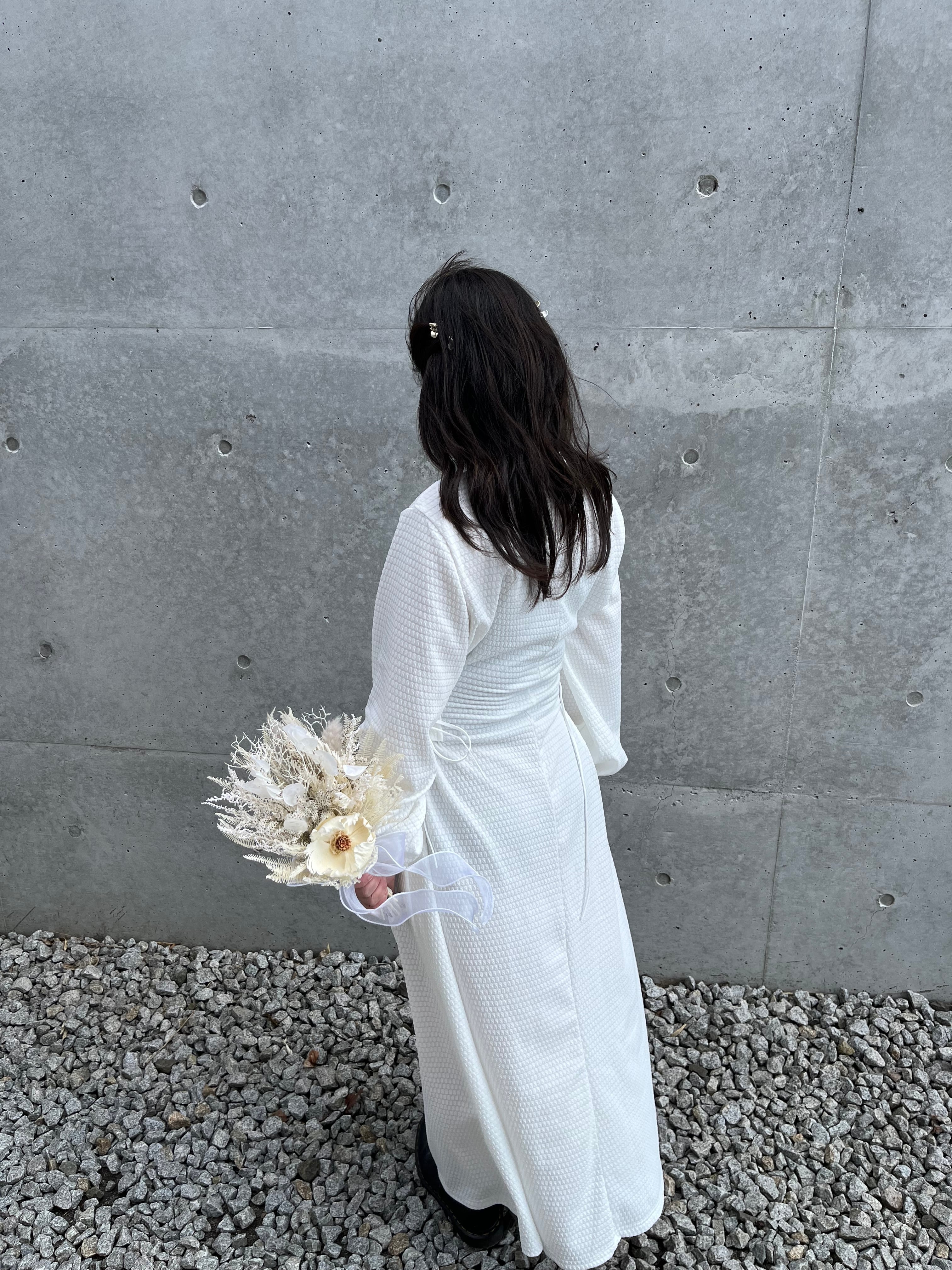 白を基調としたドライフラワーで作られたウェディングブーケは、花嫁様の格別な日を彩り、幸せな時間を演出するため、こだわりを詰め込んで作りました。