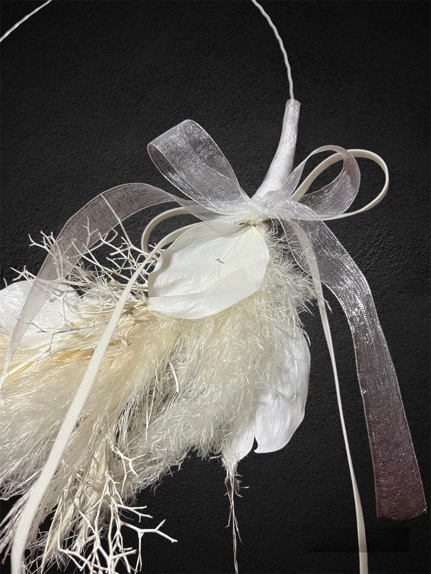 アイアンリースに雪のように白いふわふわのパンパスグラスをあしらいました。