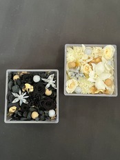 アクリルボックスに黒の花材とゴールドとシルバーをアクセントとして入れてアレンジしました。
